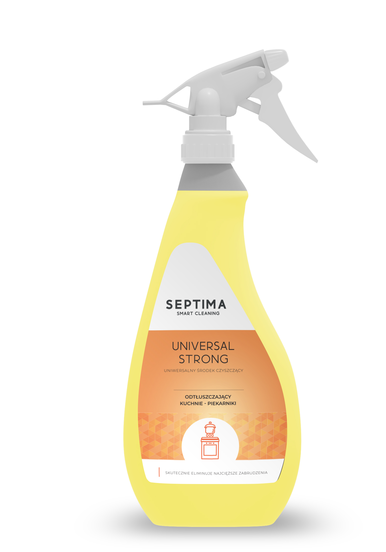 Septima Universal Stron 0,75 L to silny preparat odtłuszczający, dedykowany do bardzo zabrudzonych tłustych powierzchni. Środek przeznaczony jest do czyszczenia okapów kuchennych, grilli, płyt kuchennych, mebli ogrodowych, kosiarek, silników pojazdów, rowerów. Dzięki silnym właściwościom emulgującym nadaje się również do usuwania plam z odzieży i tapicerki.