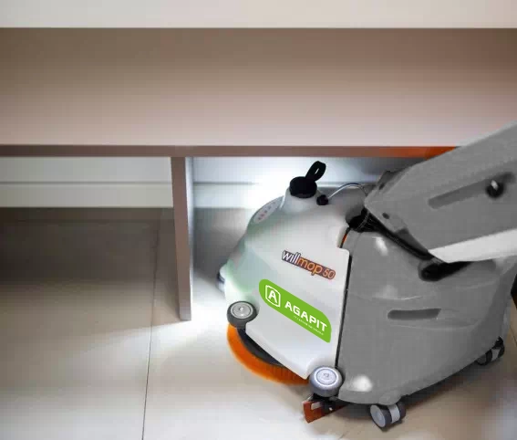 Rękojeść maszyny czyszczącej WILLMOP 50 osiąga nachylenie do 36° nad ziemią, umożliwiając dotarcie do miejsc, które do tej pory były nieosiągalne: pod stołami, między krzesłami, pod meblami o niskiej wysokości.