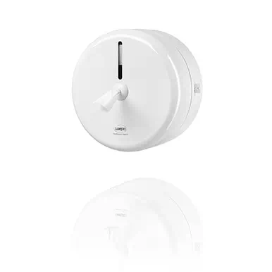 WEPA DOZOWNIK DO PAPIERU CF2 JUMBO CENTERFEED BIAŁY to profesjonalny dozownik do papieru toaletowego w rolkach jumbo centerfeed (wyciąganych od środka). Dzięki takiemu rozwiązaniu ograniczamy zużycie papieru (dozownik dozuje co 1 listek), produkując mniej śmieci.