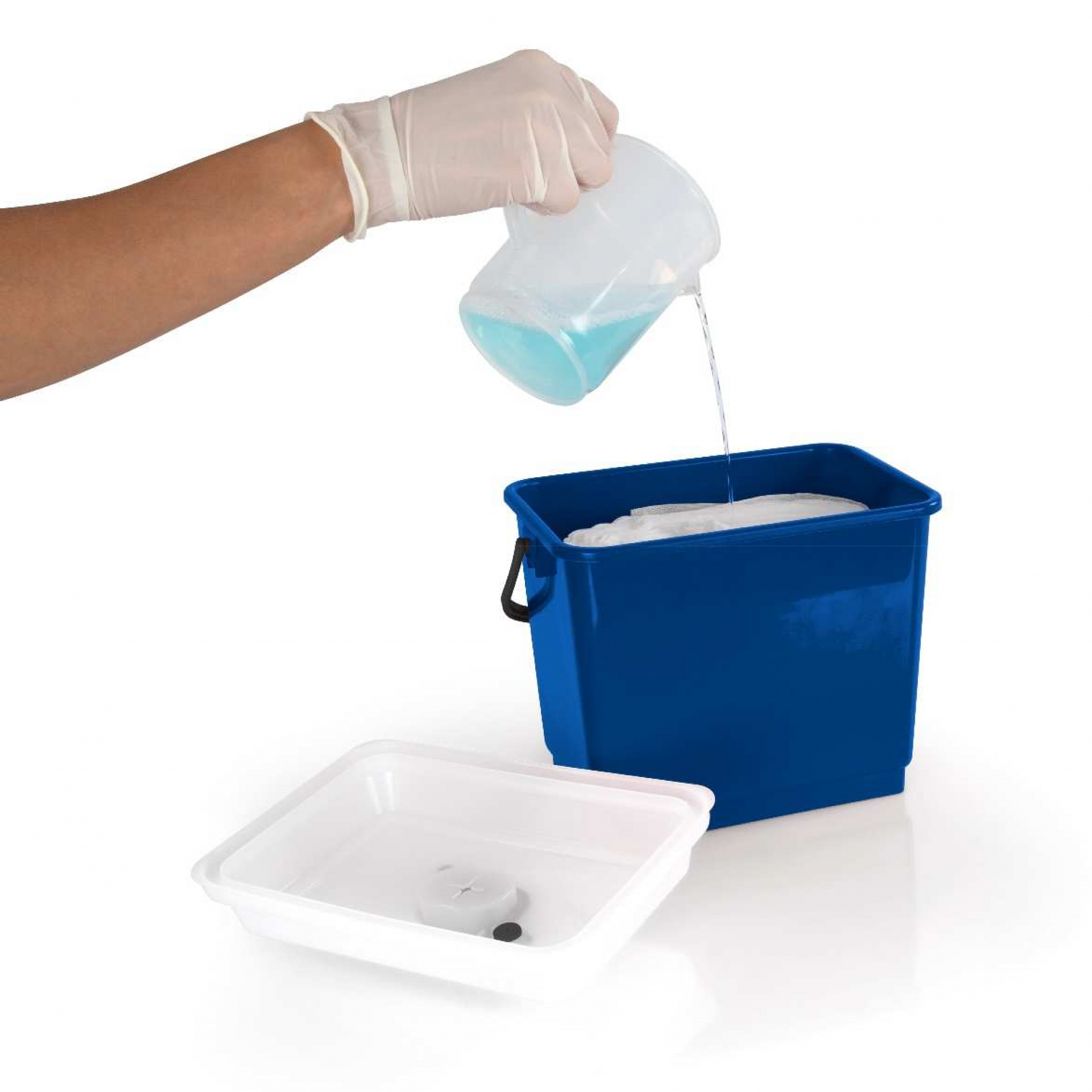 Wewnątrz wiaderka znajduje się podziałka, która ułatwia odmierzenie roztworu, którym będziemy nasączać ściereczki.