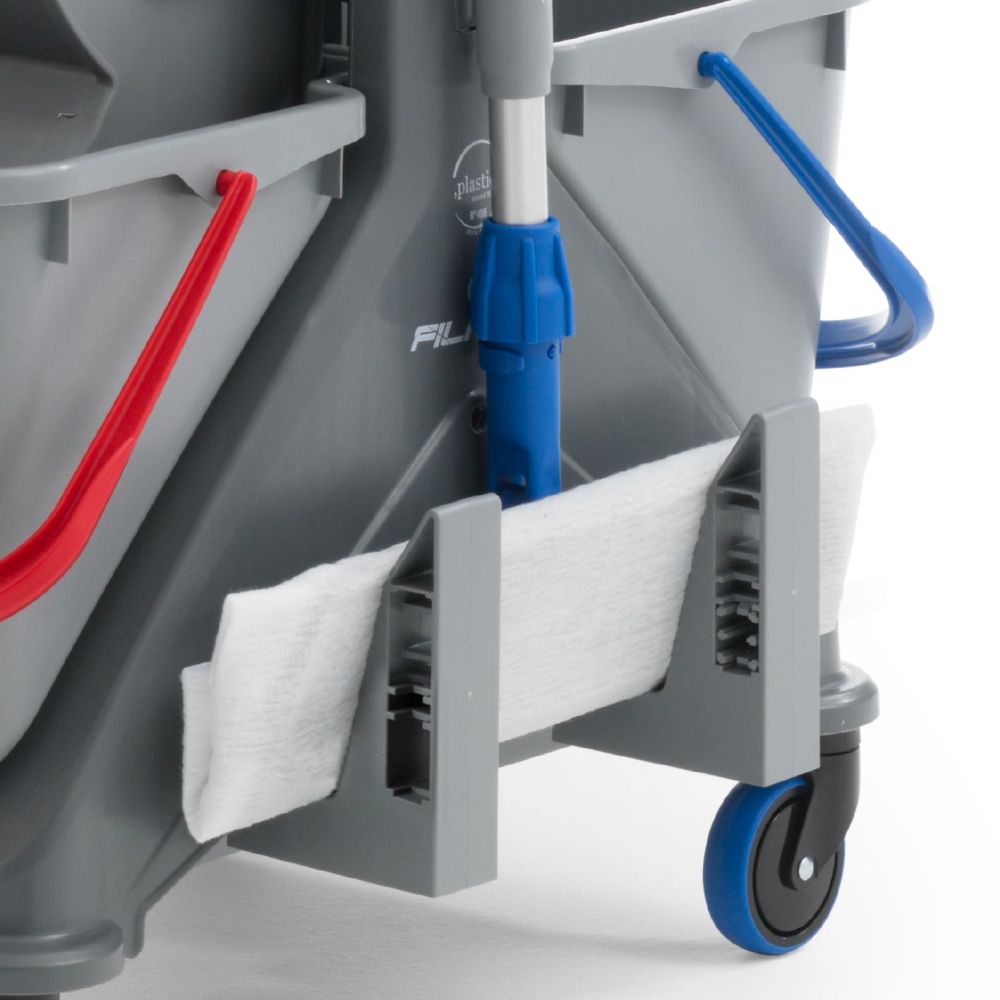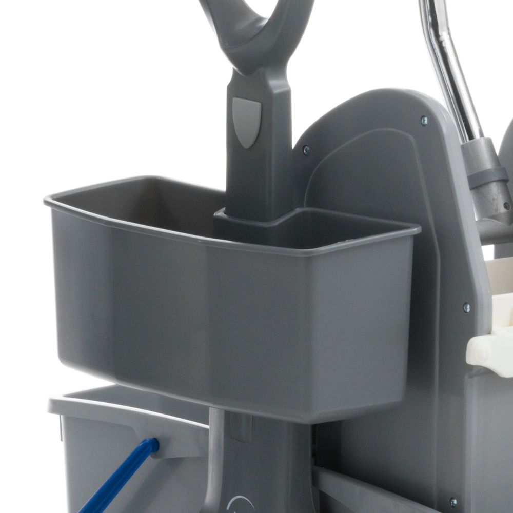 Dodatkowe miejsce na akcesoria: Wózek posiada praktyczną kuwetę boczną na chemię lub drobne akcesoria oraz zintegrowany uchwyt na miotłę/kij.