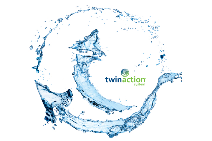 - System Twin Action koncentruje pracę na centralnej szczotce i ogranicza użycie szczotek bocznych. Działanie szczotek bocznych staje się zatem pomocnicze i są one używane tylko wzdłuż ścian i chodników, co zmniejsza zużycie wody.