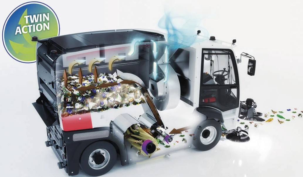 Moc systemu Twin Action umożliwia również skuteczne odkurzanie i zatrzymywanie drobnych pyłów PM10, oraz redukuje zużycie wody do minimum, umożliwiając używanie zamiatarki nawet w najtrudniejszych warunkach. Obecność specjalnego wału rozdrabniającego pozwala na bezproblemowe zbieranie nawet dużych przedmiotów; tego typu odpady są rozdrabniane, dzięki czemu można je łatwo odkurzyć bez ryzyka zatkania.