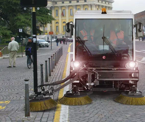 Myjka wysokociśnieniowa czyści najbardziej niedostępne narożniki, usuwa zabrudzenia z powierzchni pionowych i ścian i może być wykorzystywana także do utrzymywania w czystości samej zamiatarki. -