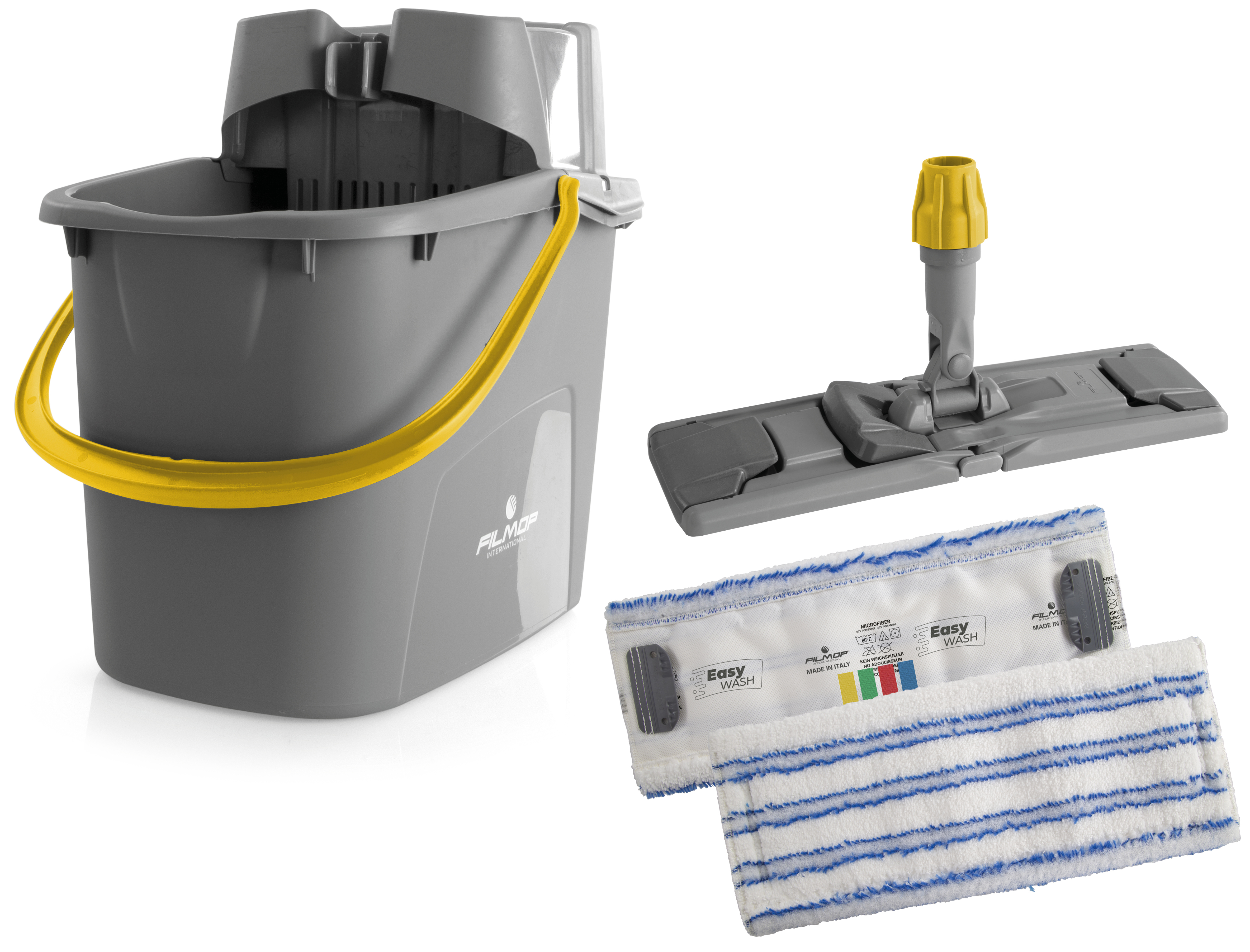 Zestaw Filmop Easy Wash składający się ze stelaża mopa, mopa z mikrofibry (40cm) oraz wiadra o pojemności 15L z nową przeprojektowaną wyciskarką.